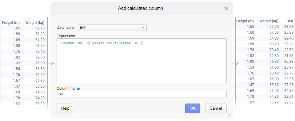 在此示例中,显示在左侧的原始数据表列出了几个人的“Height (m)”和“Weight (kg)”。基于这些数据列,可以计算体重指数 (Body Mass Index, BMI)。公式