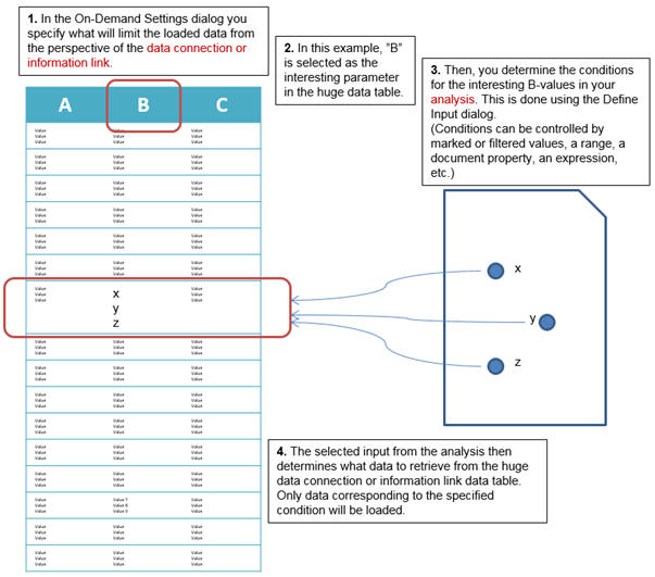 When data from a data connection or an information link is added to the analysis, you have the option to either load all data at once, or to load data on demand only. Your analysis can benefit from on-demand loading when you have access to massive amounts of data, but you only need to work with some parts of the data at a time. When configuring an on-demand data source you can specify conditions based on one or more other data tables to control what to load. You can also start by letting an on-demand data table be the first (or only) data table in the analysis if its input is defined by a document property.