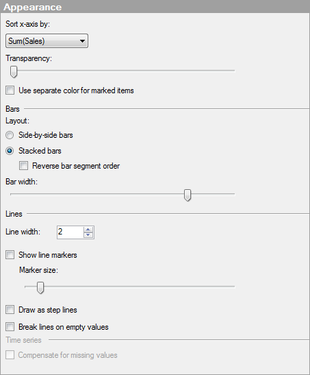 Drag the slider to change the transparency of the bars and lines. This can be useful if you want to be able to see lines or curves placed in the background through the bars, or if the visualization contains many lines which are placed on top of each other.