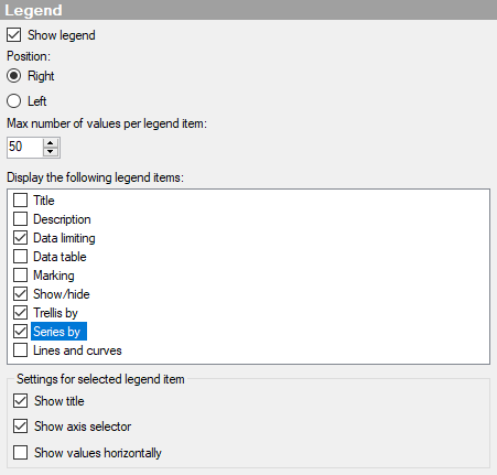 By clearing a check box you will completely hide that item from the legend. You can also select to show or hide parts of the legend information using the check boxes under Settings for the selected item in the list, see below.