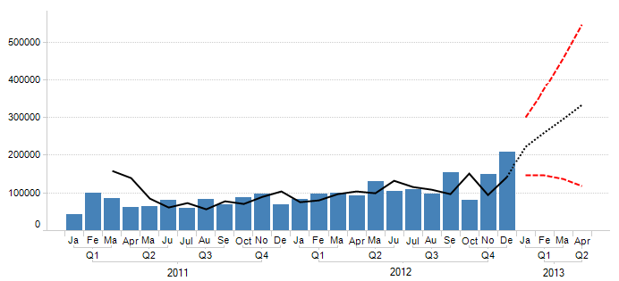 The output of a Holt-Winters Forecast is three different curves: a fitted curve showing the general variation of the measure of interest, a forecast curve predicting the future trend and a confidence interval showing how the insecurity increases the further away from the known values the prediction reaches.