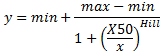 where min and max are the lower and upper asymptotes of the curve, Hill is the slope of the curve at its midpoint and X50 is the x-coordinate of the inflection point (x, y). This model requires that x>0 for all data points and that you use at least four records to calculate the curve.