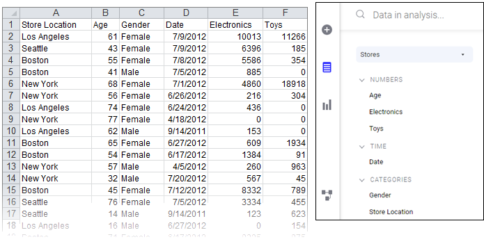 The columns are by default organized into categories to make them easy to locate. For example, loading the Microsoft Excel file below results in the Data in analysis flyout to the right. Columns that contain numerical data suitable to aggregate are gathered in the Numbers section, columns related to time are in the Time section, and columns useful for splitting the data are in the Categories section.