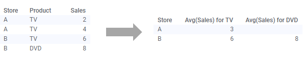 The example below shows a pivot transformation on a very simple data set. In the original data table, there are three columns and four rows. Each row contains one of two department stores, A or B; a product, TV or DVD; and a numerical value for the number of sales. The data table might look like this if a new row is added after each day.