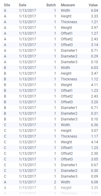 In the original data table, which contains measurements for samples of all parts, we can see which of the company's three factories—A, B or C—have produced the parts, and we can see on which date the parts were shipped, which batch they belong to as well as all the measurements for the parts.