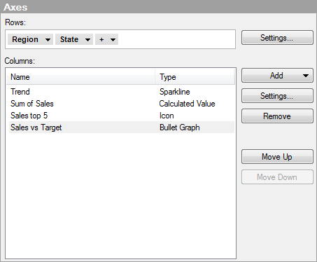 Moves the selected column up in the Columns list. The order of the columns in this list determines the order of the columns in the graphical table. |
