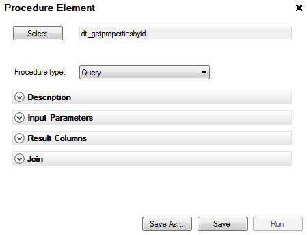 This may be one of the columns specified in the Result Columns section, but can also be another procedure column as long as it is available from the database procedure result (for example an ID column). It also lists the columns you have added from the Data Sources tree.