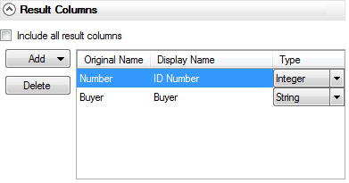 This button becomes available when the Include all result columns check box is cleared. Click on the button to add a new row in the result columns list on the right. A dialog is opened where you can enter the Original name and Display name of the result column, as well as specify its data type.