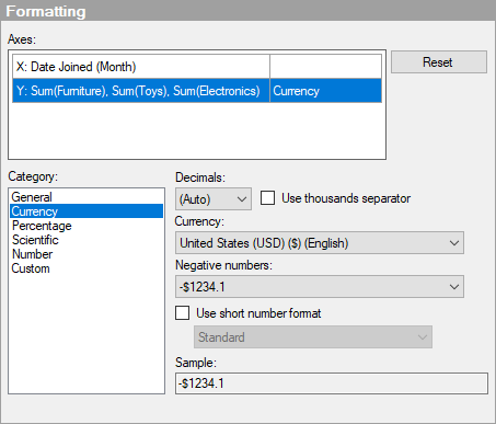 Lists the available formatting categories for the selected axis. Each category in this list has separate settings. Which categories are available depends on the data type of the selected axis. See Formatting Settings for a full description of all possible options. |