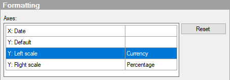 Displays which column and category are currently being used on each of the two axes in the line chart. Click the one you want to change the settings for. If the columns on the axes are of the same type, you can set formatting for both axes at the same time. f you use more than one scale on the Y-axis, each of the different scales will appear in the list, and you can apply formatting to them individually. For example, if you use dual scales, you can format the left and right scale separately as shown below.