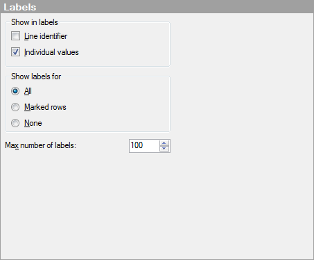 Determines whether to show labels with on all lines (All), lines containing marked rows only (Marked rows), or not to show any labels at all (None). |