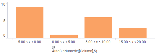 Attempts to group the values in the specified column into the defined number of bins. However, there may be more or less bins than the defined number, because the method will always result in bins with limits that are easy to read (with as even numbers as possible). The first argument is the column to bin and the second argument is the number of bins to aim for. Example: AutoBinNumeric([Column], 10) |