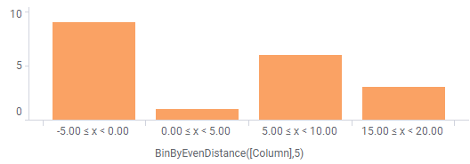 Groups the values in the specified column so there is an even distance between all bins. The first argument is the column to bin and the second is the interval length. The third (optional) argument specifies where to start counting. If no start argument is specified, the first bin starts at zero. Examples: BinByEvenDistance([Column], 10) BinByEvenDistance([Column], 10, 5) |