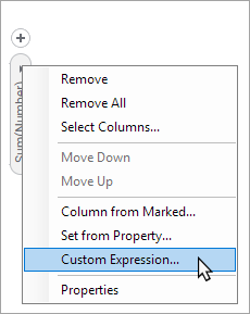 The custom expression functionality can be accessed by right-clicking on the column selector in the visualization (or in the Visualization Properties dialog) and selecting the Custom Expression… option from the pop-up menu.