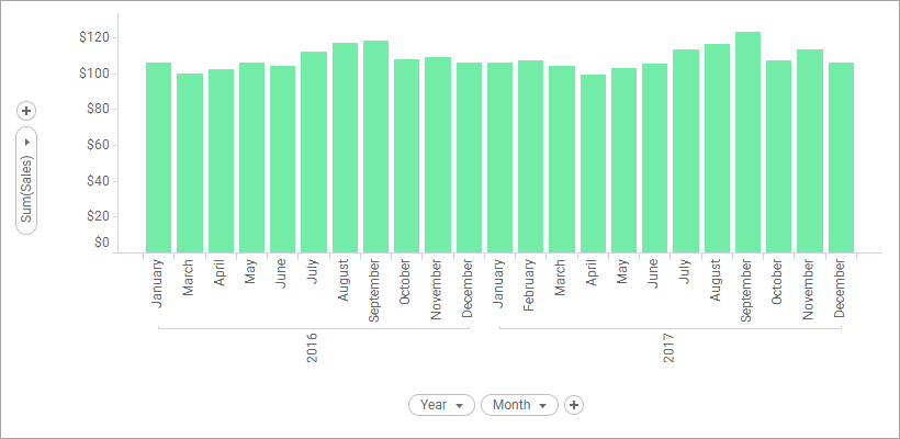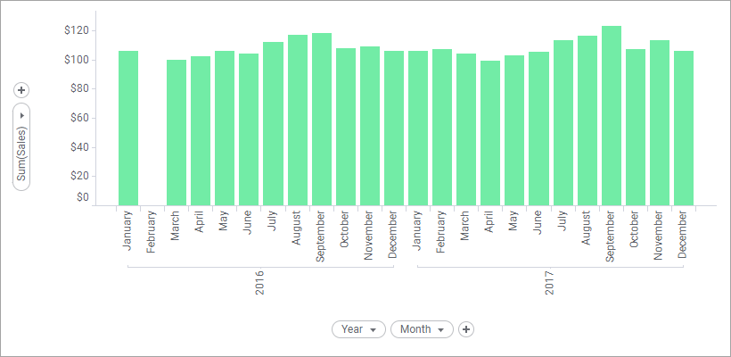 Since there is no data available for February 2016, there will not be a bar (nor a placeholder for a bar) there. This visualization is set up using the All values in data (nest) option in the Advanced Settings dialog, reached from the category axis property page for the visualization. It corresponds to the custom expression: <[Year] NEST [Month]>