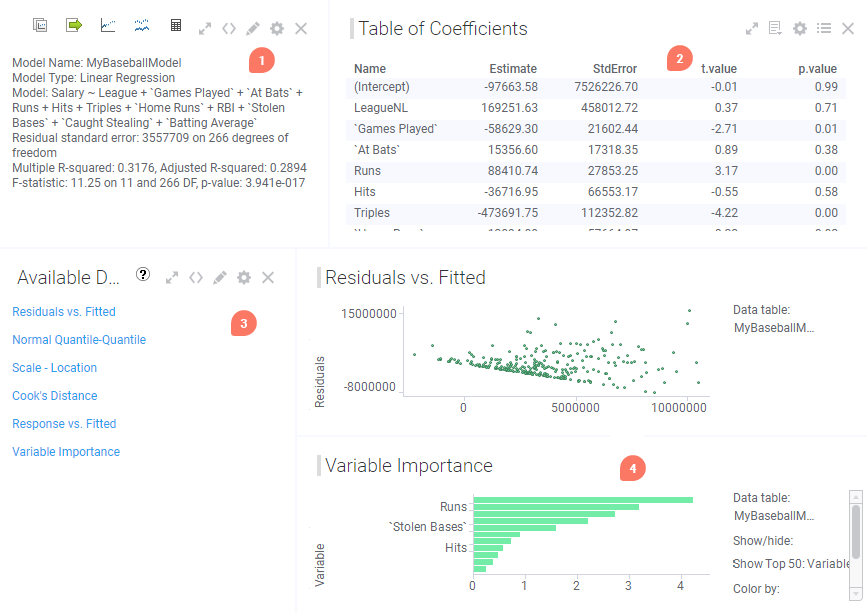 Each time a new model is created, a new page, the model page, is added to the analysis. It consists of up to four different sections: