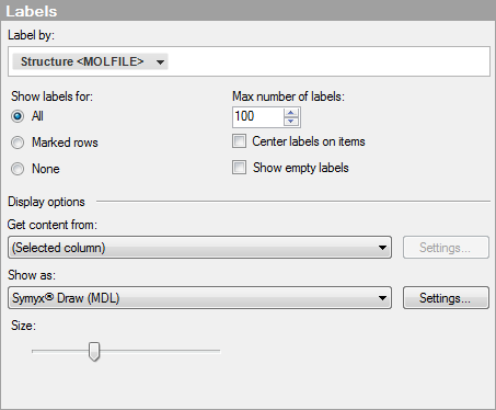 Determines whether to show labels on all markers (All), marked markers only (Marked rows), or not to show any labels at all (None). |