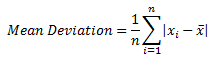 The mean deviation (average absolute deviation, AAD) is calculated as the mean of the absolute difference between a value and the mean value of the group: