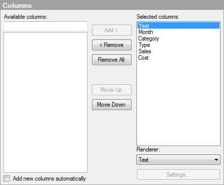 Removes the selected columns from the Selected columns list and sends them back to the Available columns list.