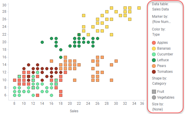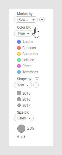 What information is available in the legend by default varies with the visualization type. For example, the legend of a pie chart will show which column determines the size of the pie sectors, and the legend of a scatter plot will state whether a column is set to represent marker size or marker shape, etc. You can edit all such parameters, by clicking the respective column selectors in the legend. When multiple data tables are available in the analysis, the legend for all new visualizations will automatically display a data table selector.