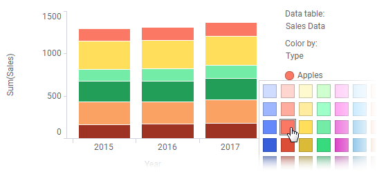 You can change the colors used in the visualization directly from the legend. Click the color box in the legend to open a color palette where you can select another color. Clicking the shape icon under Shape by similarly allows you to switch shape.