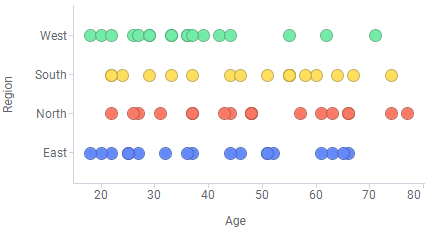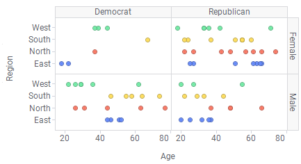 For example, if you choose to trellis a visualization based on the two variables "Gender" and "Political affiliation", this will result in four separate panels representing the combinations Female-Republican, Female-Democrat, Male-Republican, and Male-Democrat. If the "Gender" variable is used in conjunction with another variable that has five different values, this will yield ten panels. From this follows that variables with a continuous distribution and a wide range of values (for example, Real values) should be binned before they are used to form a trellis visualization. Otherwise the number of panels quickly becomes unmanageable.