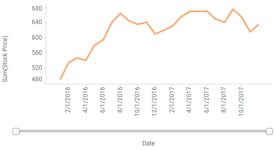 Zoom sliders are used to get a closer look at details in your visualization. The line chart below shows the stock price for a certain stock, from January 2016 to December 2017. Below the chart is a zoom slider with its handles in the end position showing the entire span of the X-axis.