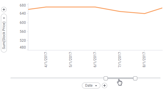 Perhaps you are curious as to what happened to the stock in a narrower span of time, say from April 2017 to August 2017. By adjusting the handles of the zoom slider, the visualization is updated and zooms in on the selected span.