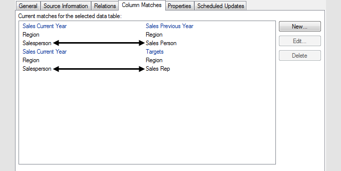 Cuando se han agregado coincidencias, se muestran en la ficha Coincidencias de columna del cuadro de diálogo Propiedades de la tabla de datos (solo cliente instalado). Haga clic en una tabla de datos para ver las coincidencias actuales de esa tabla de datos: