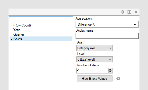 | Nivel | Defina el nivel de jerarquía con el que comparar los valores. Puede especificar un nivel designado como "Year", "Quarter" o "Month", o puede definir un número que le suba o baje un nivel de la jerarquía definida en el eje seleccionado. Si el nivel es 0 siempre comparará el nivel de hoja actual, incluso si lo cambia en la visualización, por ejemplo, con un control deslizante de jerarquías. Si el nivel se define en "Year", en realidad realiza un cálculo % de diferencia año tras año y el selector de agregación cambia consecuentemente. |