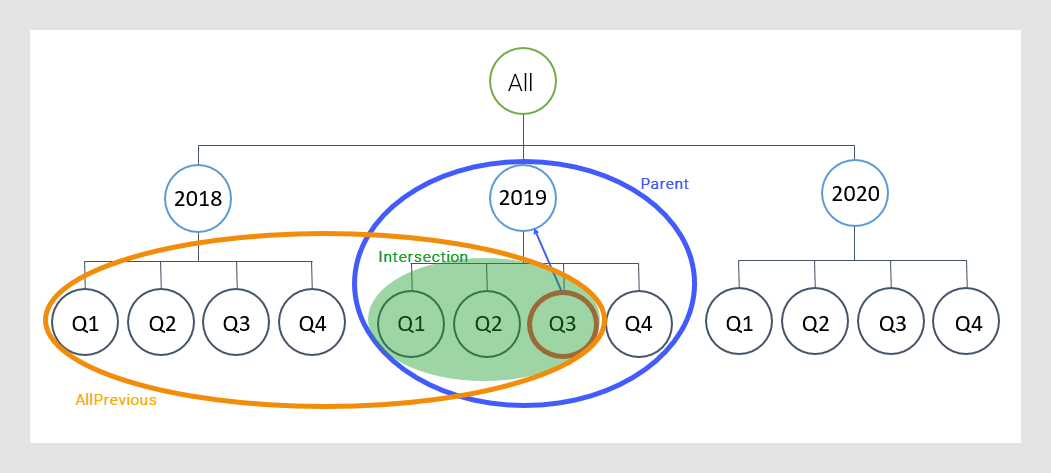 この画像は、Q3 を現在のノードとして、AllPrevious() ナビゲーション メソッドと Parent() ナビゲーション メソッドの交差部分を示しています。両方のメソッドで検出されたノードは、Q1-Q3 と 2019 です。