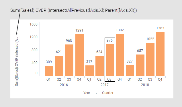 たとえば、Q3 2017 の累積合計は 976 (317+307+352) になります。これらの 3 つの棒のみを参照するには、Intersect() メソッドが便利です。AllPrevious() メソッドでは、Q1-Q4 2016 と Q1-Q3 2017 が合計に含まれ、Parent() メソッドには 2017 年の 4 つの四半期すべてが含まれます。これらの 2 つのナビゲーション モードの交差部分は、問題のバーを正確に返します。