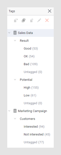 메뉴 표시줄에서 보기 > 태그를 선택하면 열리는 패널에서 태그를 보고 처리할 수 있습니다. 아래 이미지는 태그 패널의 예를 보여줍니다. 행에 태그가 지정된 후 패널에서 태그를 더블 클릭하기만 하면 시각화에서 모든 행을 마크할 수 있습니다.