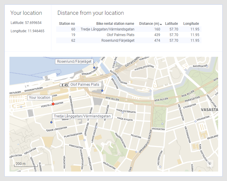 This example shows bike rental stations in a Swedish city. Each rental station has a location specified by latitude and longitude. You can see the distance (measured in metres) from your current location to the three rental stations that are marked in the map chart.