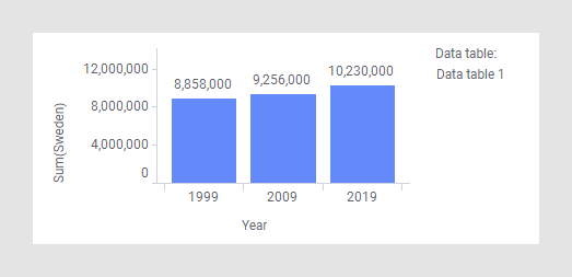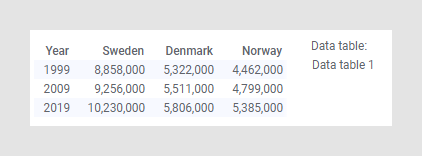 A tabela de dados 1 contém dados populacionais para Suécia, Dinamarca e Noruega por três anos, e o gráfico de barras abaixo visualiza a população anual da Suécia.