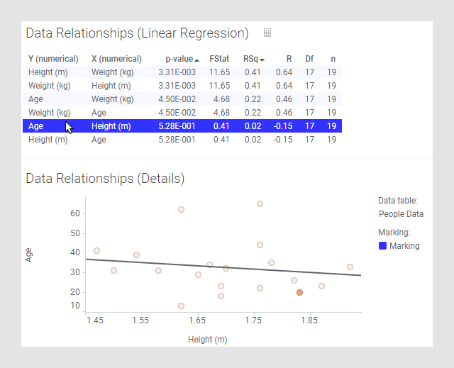 O resultado ao usar Relacionamento dos Dados é uma nova tabela de dados onde cada linha mostra a correlação entre duas colunas da tabela de dados original. A linha inclui os nomes das duas colunas comparadas, e valores para o quão bem elas se correlacionam.