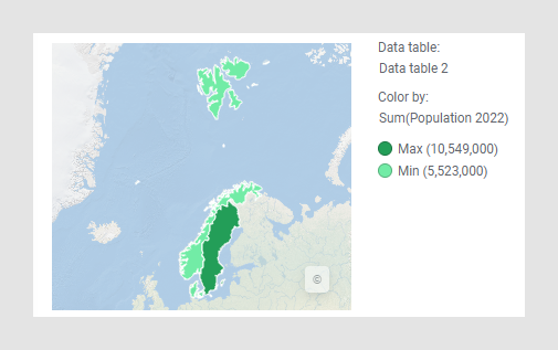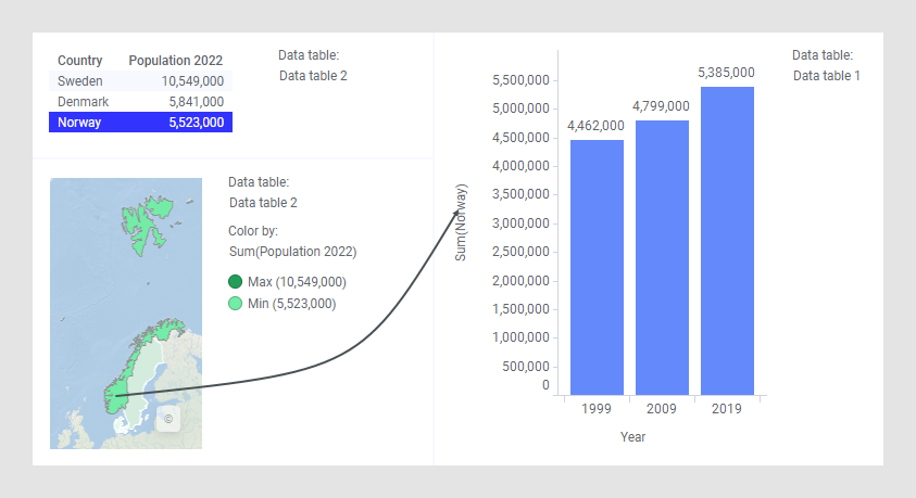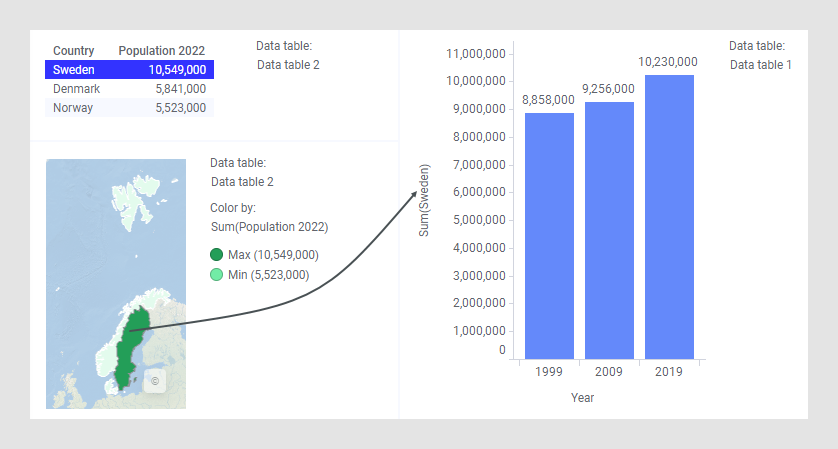 Agora você poderá, por exemplo, marcar um país no gráfico do mapa, e a população anual desse país será exibida no gráfico de barras. Veja as imagens abaixo em que, primeiro, clica-se em “Suécia” e depois em “Noruega”.