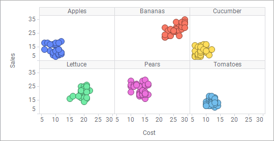 In the scatter plot example below, sales is plotted against cost for a number of different products (colored by product). It shows a low positive correlation.