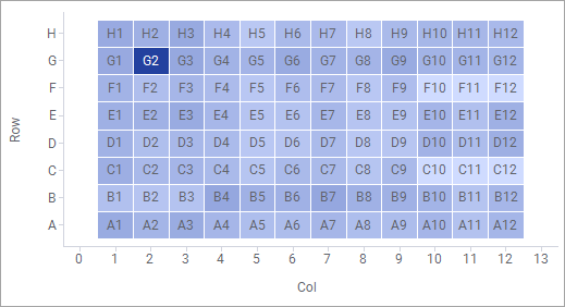 This example shows the results of an experiment conducted on an assay plate consisting of 96 wells. Each marker in the scatter plot represents a well on the assay plate, and the markers’ colors represent the results of the experiment for each of the wells on the plate. Using this setup to copy the actual layout of the assay plate is a way to enhance the readability of the data. It becomes easy to notice that the well represented by the marker G2 stands out compared to the other wells. Labels are always centered and displayed directly on tiled markers. Therefore, they cannot be moved around as is otherwise possible in a scatter plot.