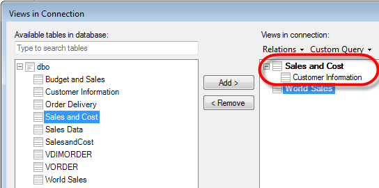 관계형 데이터베이스를 기반으로 하는 데이터 연결은 분석에서 데이터 테이블로 사용 가능한 하나 이상의 보기를 포함할 수 있습니다. 각 보기가 데이터베이스의 소스 테이블 둘 이상을 구조적 관계를 통해 단일 보기로 조인하여 만들어질 수도 있습니다. 이러한 관계는 데이터베이스에서 데이터베이스 관리자에 의해 설정되었을 수도 있지만 설치된 클라이언트의 연결의 보기 대화 상자에서 수동으로 만들 수도 있습니다.