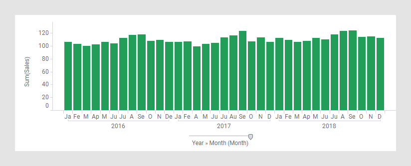 표현식은 월별 차이를 계산합니다. 판매 수치가 이전 월에 비해 감소한 경우 막대가 음수 값이 됩니다. 이제 가장 큰 하락이 2017년 9월에서 10월 사이에 발생했음을 쉽게 알 수 있습니다.