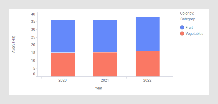 根据“类别”列为条形栏着色,该列含有以下两类值:“水果”和“蔬菜”。您还可以并排查看这些颜色类别(如以下条形图所示)。在图表属性中找到布局部分,然后单击“并排”选项。