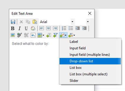 在编辑模式下,向文本区域添加属性控件。在此示例中,我们添加一个下拉列表。