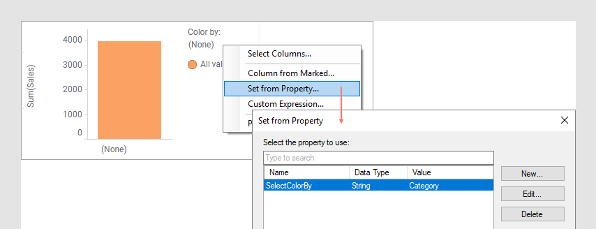 最后一步是将属性连接到应该对所选属性值做出反应的位置,在此示例中为条形图中的“颜色依据”选择器。右键单击该选择器,选择“从属性中设置”,然后选择新属性。