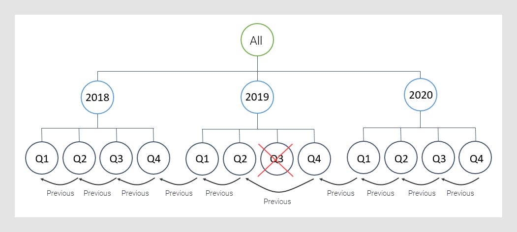如果紧跟在当前节点前面的值不可用(例如,以上示例中的 Q3 2019 值),则此方法将查找最靠近的上一个非缺失值(在此示例中为 Q2 2019)。
