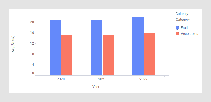O gráfico de barras exibe dados utilizando um número de barras, cada um representando uma categoria em particular. A altura de cada barra é proporcional à agregação específica (por exemplo a soma dos valores na categoria que esta representa). As categorias podem ser algo como um grupo de idade ou uma localização geográfica. Também é possível colorir ou dividir cada barra em uma outra coluna categórica nos dados, o que permite que você veja a contribuição de diferentes categorias para cada barra ou grupo de barras no gráfico de barras.