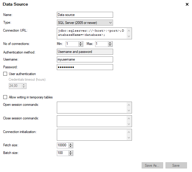 Min is the minimum number of database connections created for a given data source. Max is the maximum number of database connections created for a given data source. There can never be more connections open at a given moment than the specified max number. Note: If you use SAS/SHARE, ODBC or other data sources that do not support pooled connections (i.e., there is no valid ping command), set both min and max to 0. |