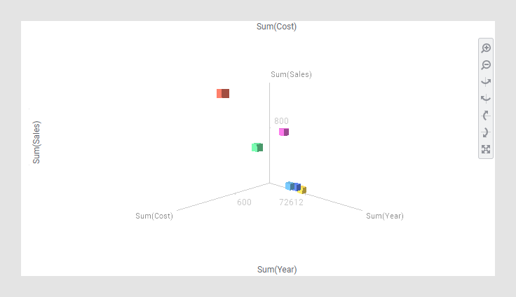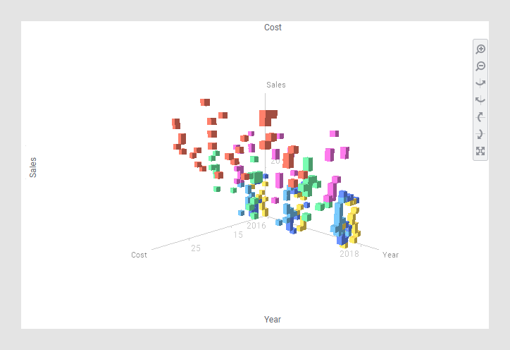 아래 3D 산점도에서는 판매, 비용 및 연도를 색으로 구분된 많은 제품에 대한 해당 항목을 기준으로 그립니다.