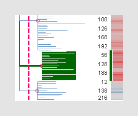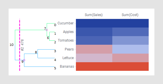 Colunas adicionais na tabela de dados do dendrograma são colunas identificadoras de folha. No exemplo acima, há apenas uma coluna identificadora, mas é bem possível ter várias. As colunas identificadoras de folha são usadas para combinar e classificar o mapa de calor.