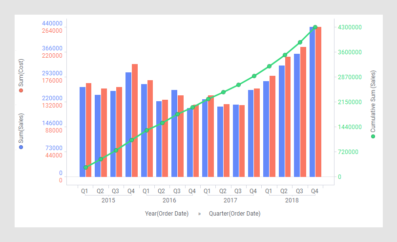 In einem Kombinationsdiagramm haben Sie die Möglichkeit, Balken und Linien in einer einzigen Visualisierung anzuzeigen. Aufgrund des Überlagerungseffekts werden Linien über den Balken gezeichnet. Es ist einfach, Werte für verschiedene Spalten oder Kategorien in Ihren Daten zu vergleichen. Trends können ermittelt und Abweichungen direkt erkannt werden. - Sortieren des Kombinationsdiagramms